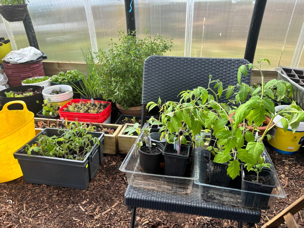 The polycrub is bursting at the seams with seedlings and there are more to be moved in shortly.