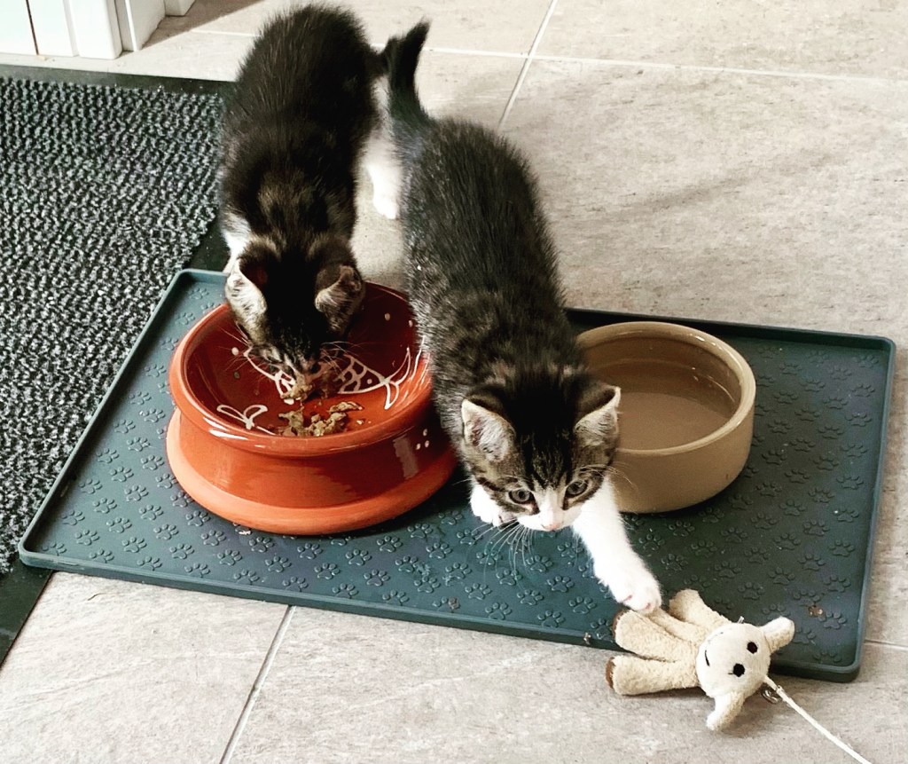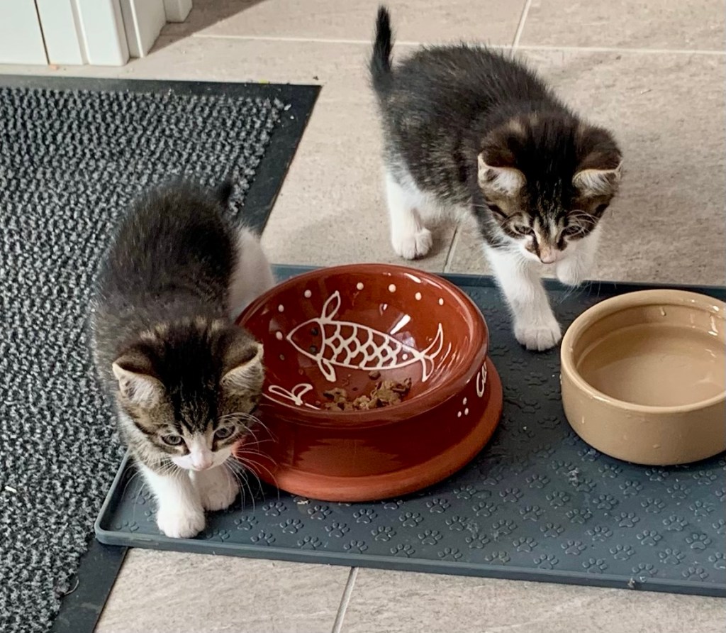Husband found them wedged in behind the dryer. Clearly plan A, which was to house them in the utility room for a bit until they were used to us was not going to work until we’d managed to cat-proof it a little better, so we moved them into the boot room with their food, toys and kitty litter.