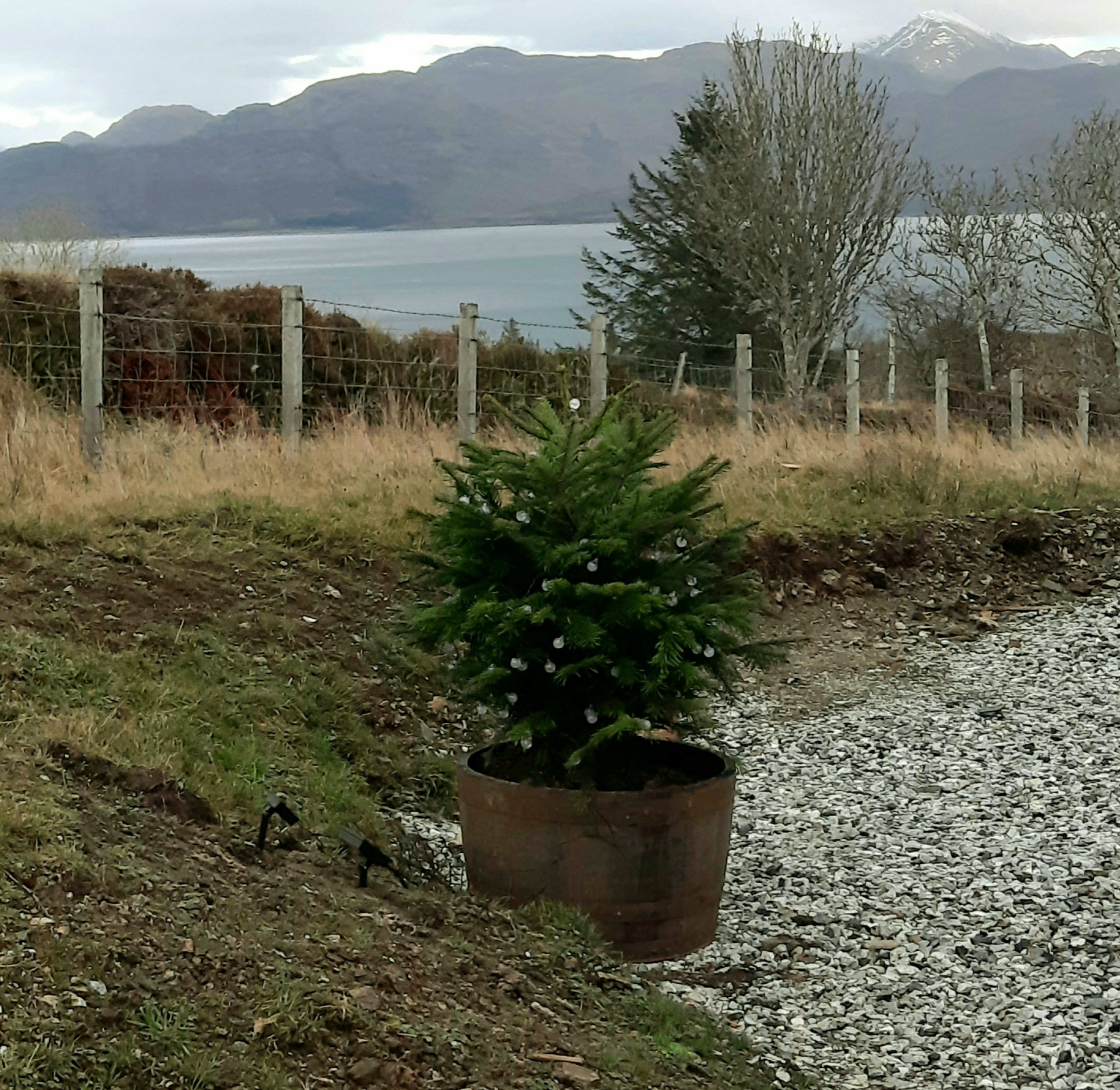 I’ve decided that Olive deserved a bit of Christmas bling so she has been draped with cool LED lights and a few paper baubles that are light enough not to damage her fragile, spindly branches.