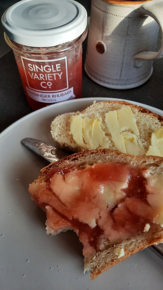 Husband enjoyed his straight with no embellishments, washed down with a cup of coffee. I decided to Northern Up my slice with butter and rhubarb jam, Yorkshire style. Which was unutterably delicious. No judgements, now!
